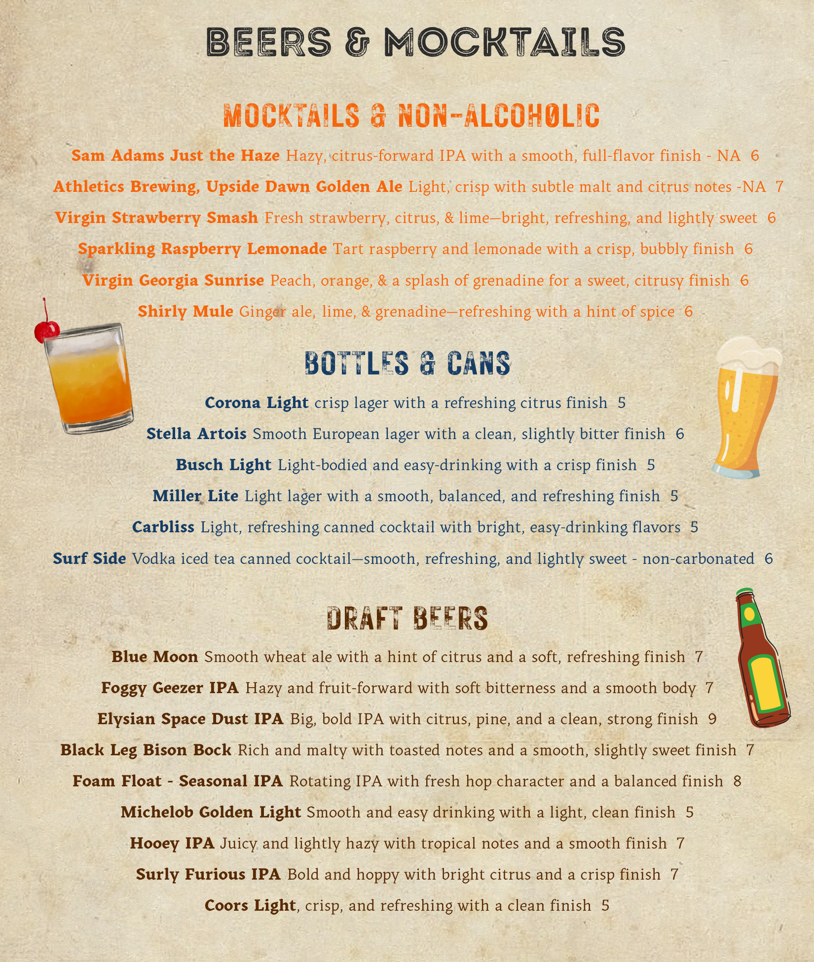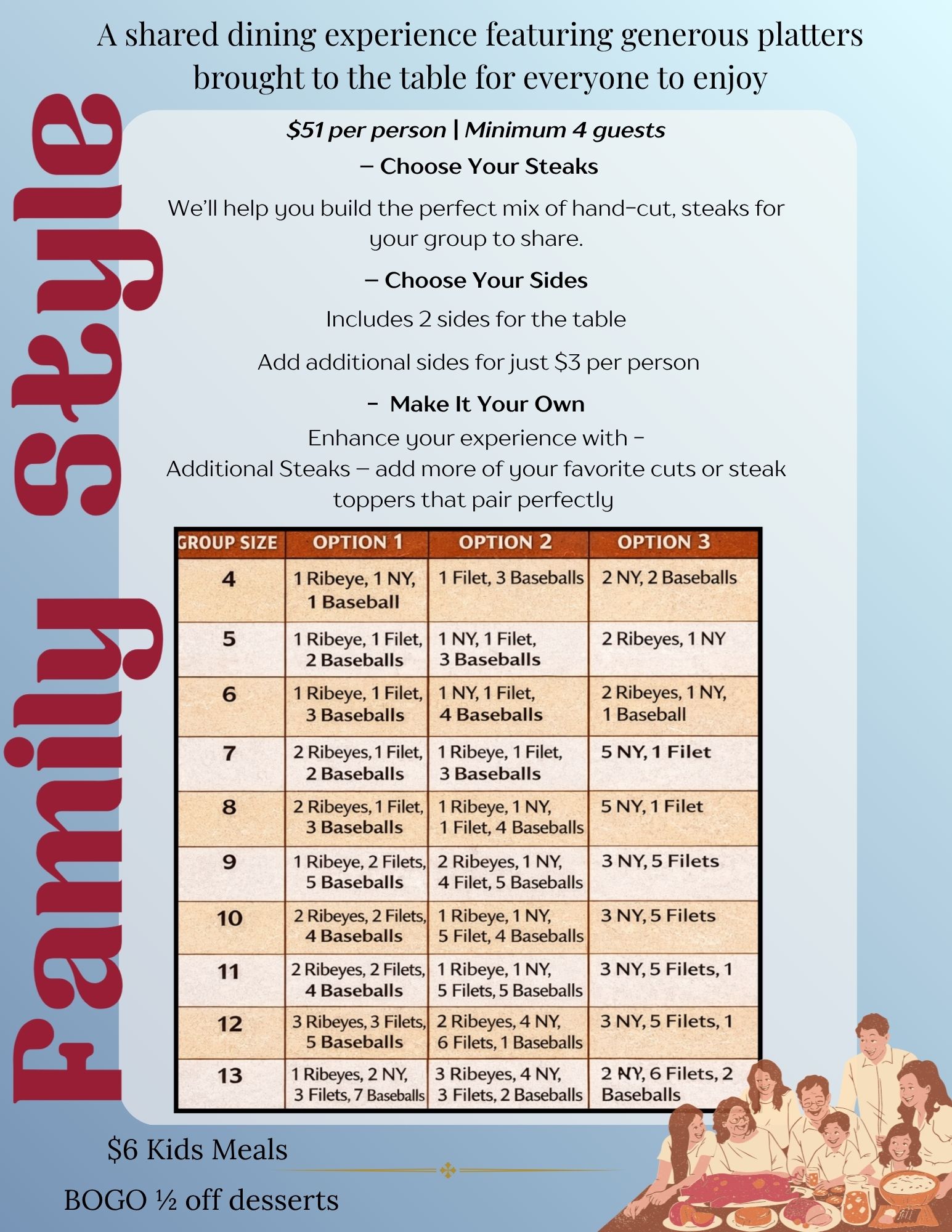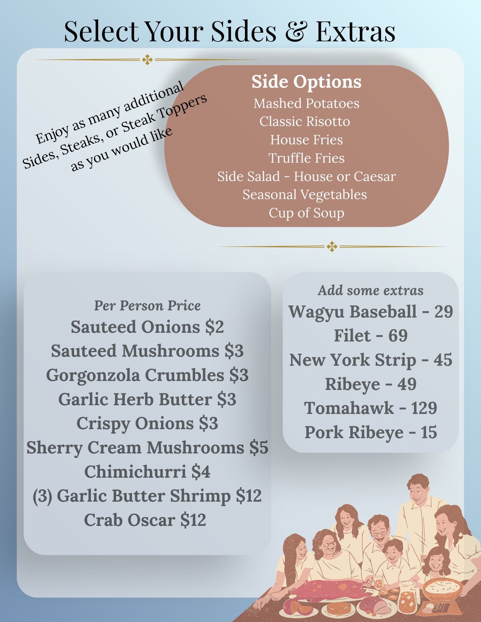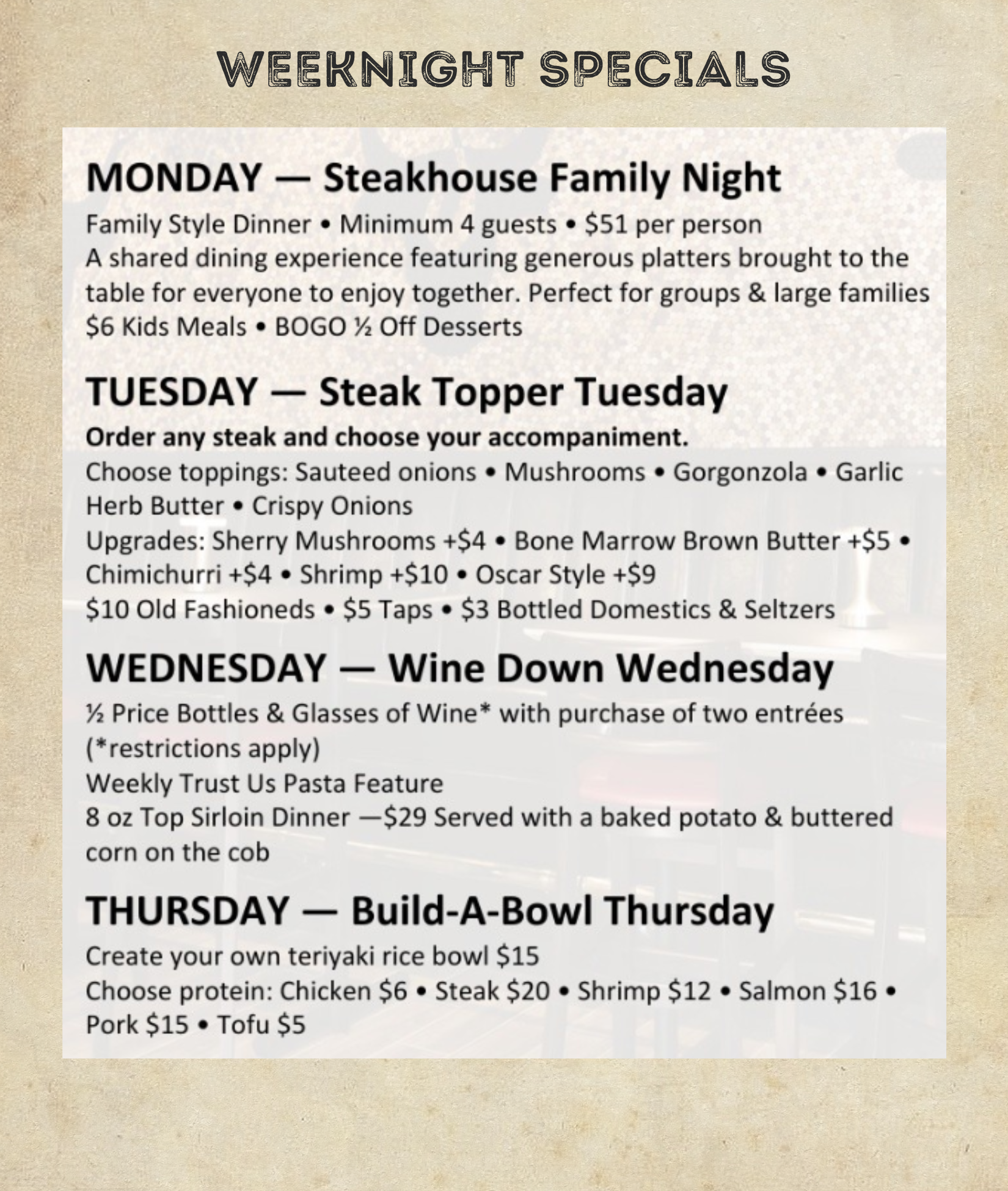 While steak is always our top choice on the menu, we also have an amazing selection of salad, fish, chicken, pasta, burgers, and sandwiches. Don’t forget to savor your meal with a nice pairing of wine, cocktail, or beer.